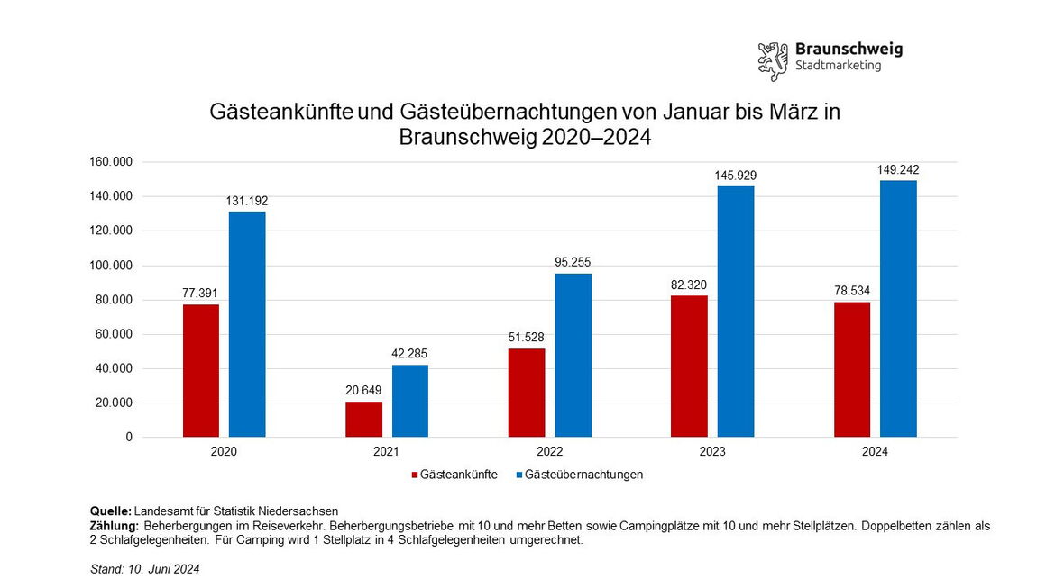 Rund 78.500 Gästeankünfte und 149.200 Übernachtungen hat das Landesamt für Statistik Niedersachsen (LSN) von Januar bis März 2024 in Braunschweig erfasst. Das bedeutet einen Rückgang der Ankünfte um rund fünf Prozent bei einer gleichzeitigen Steigerung der Übernachtungen um rund acht Prozent im Vergleich zum Vorjahreszeitraum.